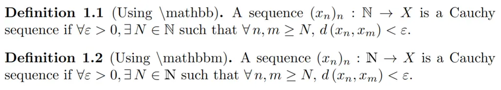 For sets like \(\mathbb{N}\), you should use \mathbbm{N} (from bbm package) instead of mathbb{N} (from amssymb). See the difference in how the rendering of the set of natural numbers \(\mathbb{N}\) differs, using the same example as the previous section: