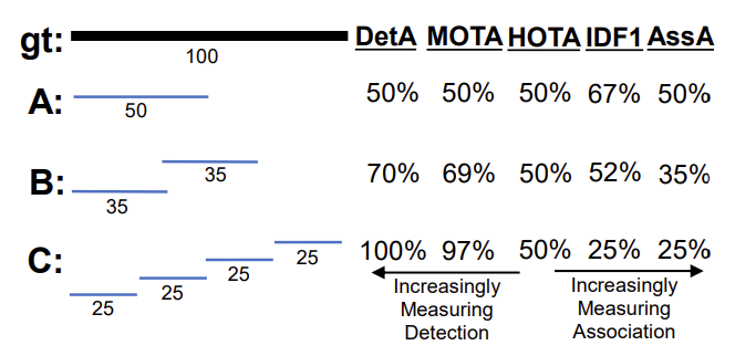 Source: HOTA Paper.. A simple tracking example highlighting one of the main differences between evaluation metrics. Three different trackers are shown in order of increasing detection accuracy and decreasing association accuracy. MOTA and IDF1 overemphasize the effect of accurate detection and association respectively. HOTA balances both of these by being an explicit combination of a detection score DetA and an association score AssA.