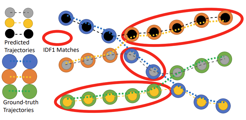 - In the above tracking example which shows how the single best trajectory matching, as performed by IDF1, can result in unintuitive matches between trajectories.
